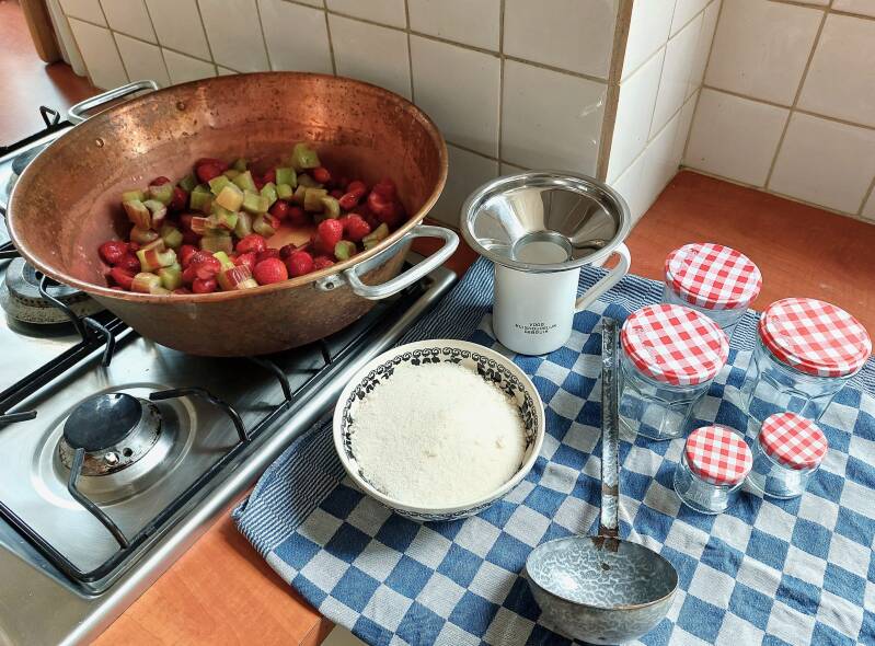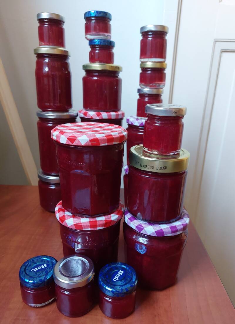 Als dan van één soort fruit alles geplukt was, kon er jam van gemaakt gaan worden. Het gewenste fruit werd weer uit de diepvries gehaald, alle benodigdheden werden klaargezet en na een paar uur stond er dan een flinke hoeveelheid potten jam op het aanrecht.