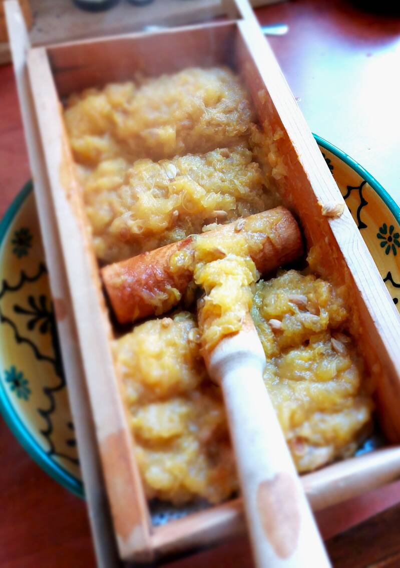 Het sap dat daarbij vrijkomt, vang je ook op. De schillen snij je allemaal in dunne reepjes. Het vruchtvlees en de pitten kook je met wat water. Daarna wrijf je dat door een zeef.