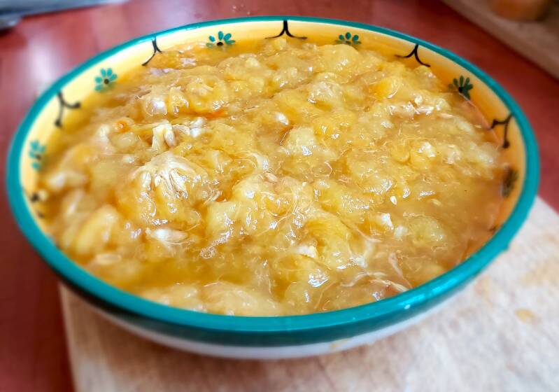 De sinaasappels hebben uren gekookt en van de sinaasappels wordt zowel het sap, het vruchtvlees als de schillen gebruikt.