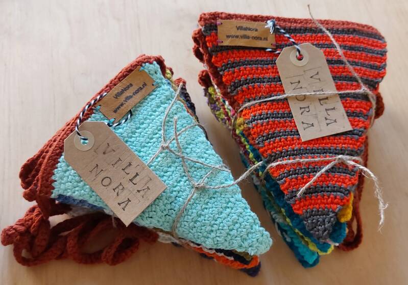 Van het breien van al die verschillende babydekentjes had ik na een paar jaar een flinke verzameling bolletjes garen over die ik niet meer kon gebruiken voor dekentjes. Ik had al eens bij een open lucht evenement in een bos slingers van vierkante lapjes stof zien hangen. Maar naaien is niet mijn ding, dus ik begon van die restjes garen vierkantje lapjes te haken. Een mooie manier om het haken, dat ik lang geleden ook deed, weer onder de knie te krijgen. Samen met mijn oma haakte ik gordijntjes en vierkantjes voor spreien van wit of ecru katoen. Maar eenmaal aan elkaar gehaakt en opgehangen, leek het nergens naar, dus ben ik driehoekjes gaan haken en daar slingers van gaan maken. Dat ziet er al beter uit, hoewel ik nog op zoek ben naar een manier om ze aan elkaar te maken zonder dat ze gaan krullen als je ze ophangt.