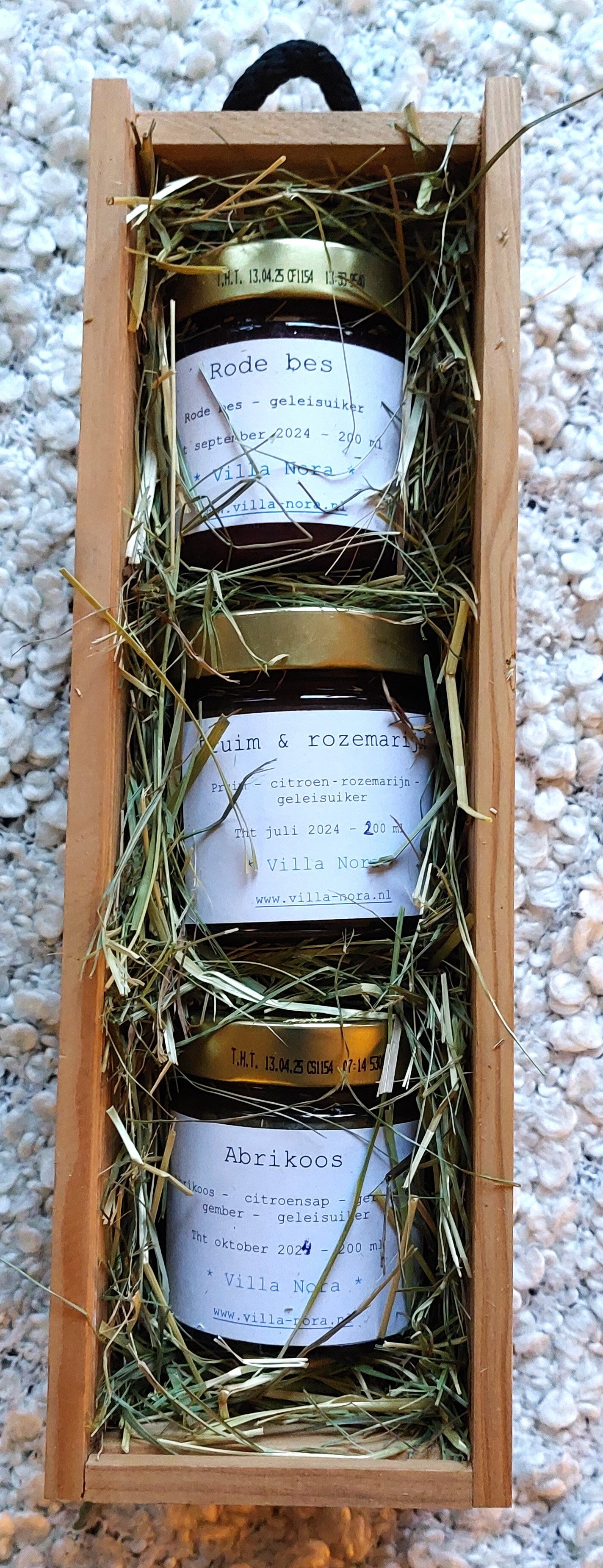 Nieuw zijn de geschenkpakketten: meerdere potjes jam in een houten kistje. Leuk voor een verjaardag of als cadeautje van de Sint. Er rijmen best wel wat woorden op jam, dus een gedicht is zo gemaakt.
