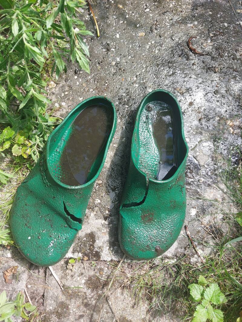 Waar mijn vader in zijn laatste jaren altijd bang voor was, door de Parkinson werd hij sowieso angstiger, gebeurde deze zomer. Terwijl ik probeerde een tak van het wilgenroosje uit de sloot te trekken, waarbij ik leunde op een in mijn ogen stevig paaltje dat langs de slootkant stond, bleek het paaltje niet bestand tegen mijn gewicht en met een enorme plons ging ik voorover met m’n kop naar beneden de sloot in. Blij dat niemand om me heen dit aanschouwd had, kroop ik een halve minuut later kleddernat, vies en stinkend naar slib weer op de kant. Gelukkig scheen de zon, liggen er op de tuin wat extra kledingstukken en zijn er manieren waarop je ook zonder ondergoed fatsoenlijk kunt tuinieren.