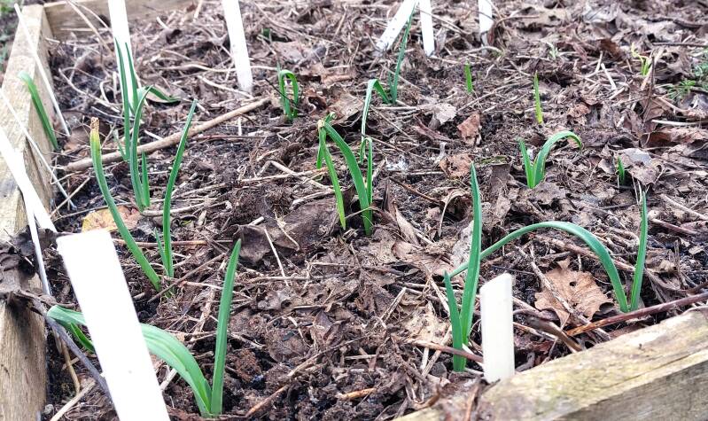 In januari lag er nog een dun laagje ijs op de sloot, maar de in oktober gepootte knoflook besloot al wel boven de grond uit te komen kijken.