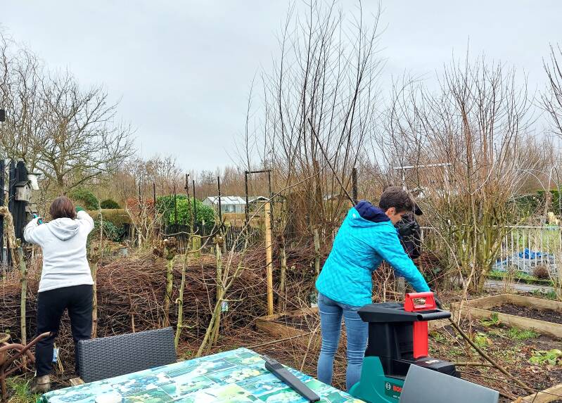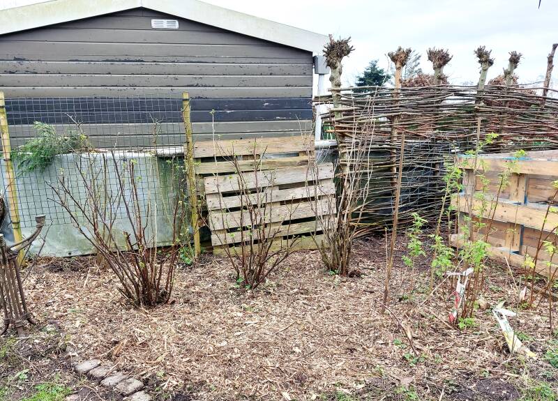 Met hun hulp zijn alle wilgen geknot, de takken hergebruikt in afrasteringen en in de takkenril of verwerkt tot snippers voor de paadjes. De regenton is aan de regenpijp gemonteerd en de compostbak is opnieuw gebouwd van pallets die we ophaalden bij een verzorgingshuis in de buurt. We haalden grote tegels op, gekocht via Marktplaats bij iemand in de buurt, om ergens dit jaar een nieuw terras van te leggen. En alle bessenstruiken werden gesnoeid. We hadden mooi weer - een zonnetje en weinig wind - en konden de hele dag buiten werken, eten en drinken.